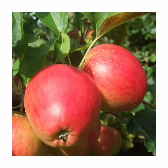 Very attractive ‘pearmain’ shaped bright red fruit with attractive yellow lenticels and a superb sweet aromatic flavour that stores throughout winter.